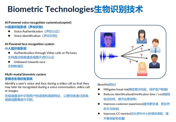 Aculab 的生物识别技术涵盖声纹识别和人脸识别,通过深度学习算法,精准识别用户身份,无种族偏见,支持多语言环境。声纹识别利用语音的独特性,结合行为和生理特征,实现快速、安全的身份验证;而人脸识别则通过视频通话或图片进行认证,适用于多种场景。
