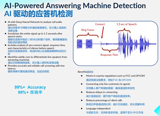 Aculab 的 AI-AMD 技术采用深度神经网络,能够在语音开始后 1.5 秒内精准分析通话音频模式,区分真人与答录机,准确率高达 99%。该技术满足各国法规要求,如 FCC 和 OFCOM,显著降低无效通话比例,提升呼叫中心效率。