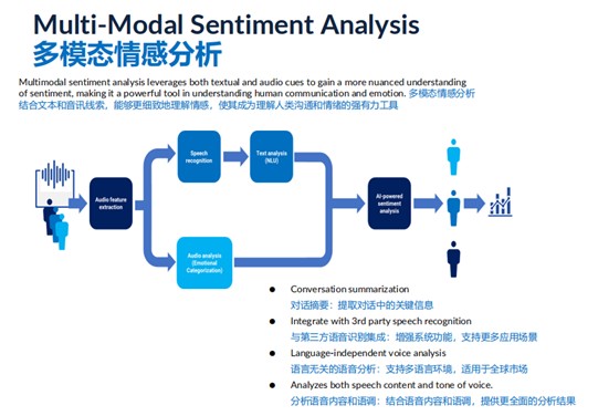 Aculab 的多模态情感分析产品结合文本和音频线索技术,能够更细致地理解人类情感和沟通意图。它支持语言无关的语音分析,适用于全球市场,可生成对话摘要,助力企业优化客户服务。