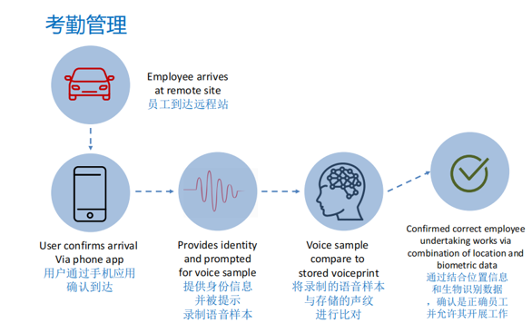 Amcat公司 使用 Aculab 的声纹识别技术,结合位置信息,确认员工身份并允许其开展工作,有效防止代打卡等违规行为,提升企业管理效率。